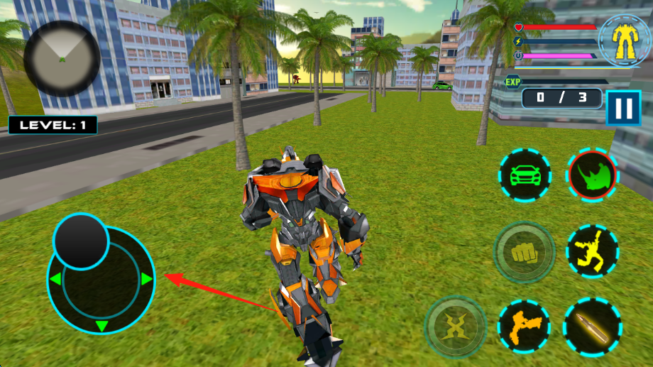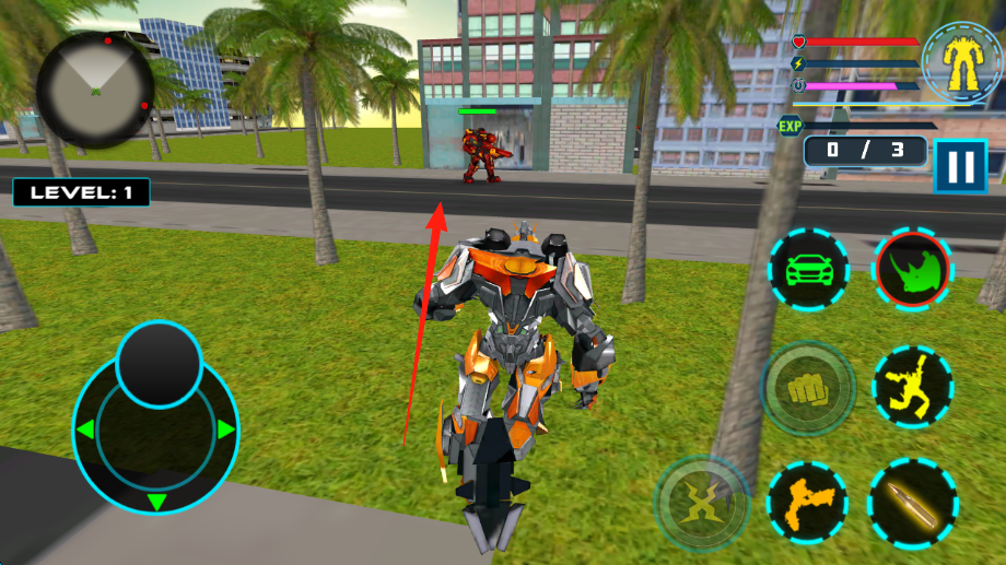 3、右侧技能键,可近战攻击、躲避,点击汽车图标可变形载具,利用不同形态战斗,击败敌人,完成关卡。