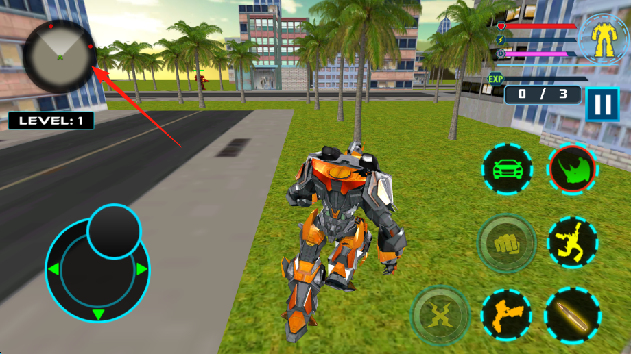 1、用左下角虚拟摇杆控制机器人在城市场景草地、街道、建筑移动,地图雷达左上角指引目标方向。