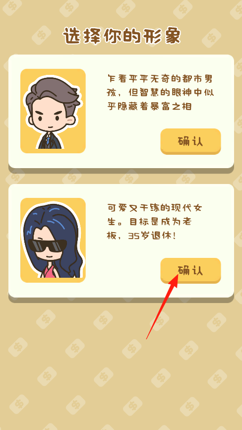 1、点击确认按钮就能选定你喜欢的角色,西装男孩和墨镜女生都有不同的背景故事和初始属性,选好角色后系统会自动保存,之后想换形象可以随时回来重新选择。