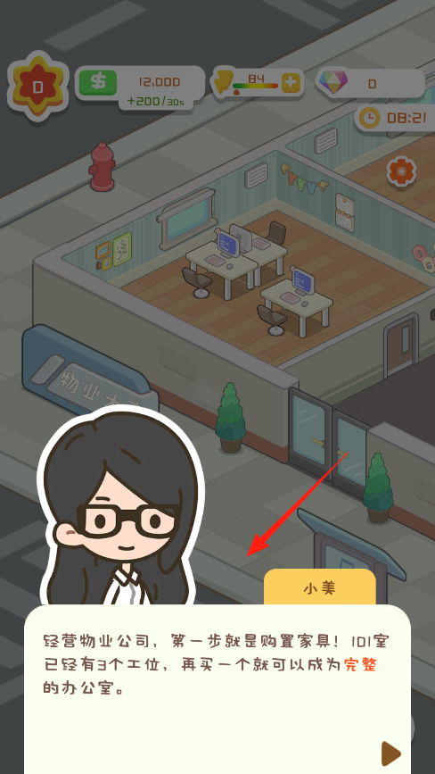 2、每30秒会自动增加200金币,攒够钱就能点击空位购买新工位来扩建办公室,注意看小美的提示,完成4个工位的办公室配置就能解锁新的经营功能。