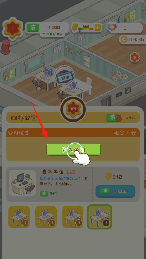 3、点击引入公司可以招租新客户,每个入驻的公司都会带来持续租金收入,升级工位要花5000金币,但能提高员工工作效率,让公司收益增长更快。