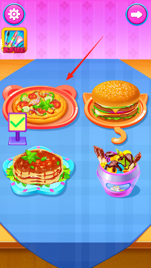 1、桌面上摆着四道可爱的菜品,想选哪个直接点熊脸盘子就行,选中的菜会打上绿色对勾,左上角的更多精彩能解锁新菜谱,不过要先完成当前任务才能看到新内容哦。