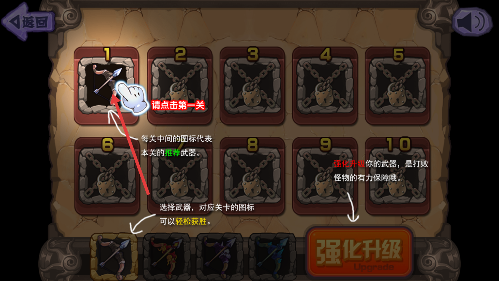 1、进入关卡选择界面,点击【第一关】,参照【推荐武器】选适配武器,提前【强化升级】武器增强战力。
