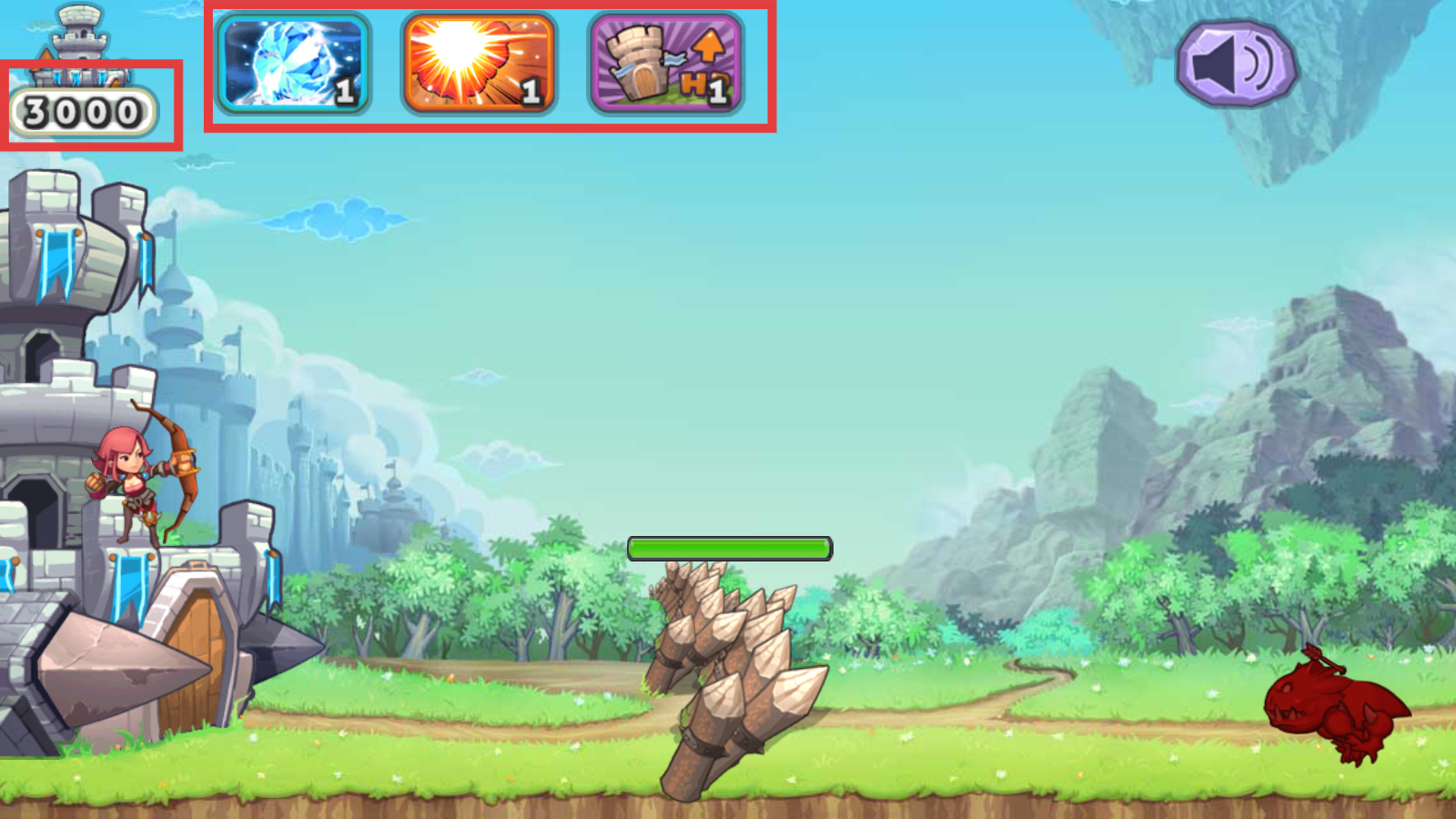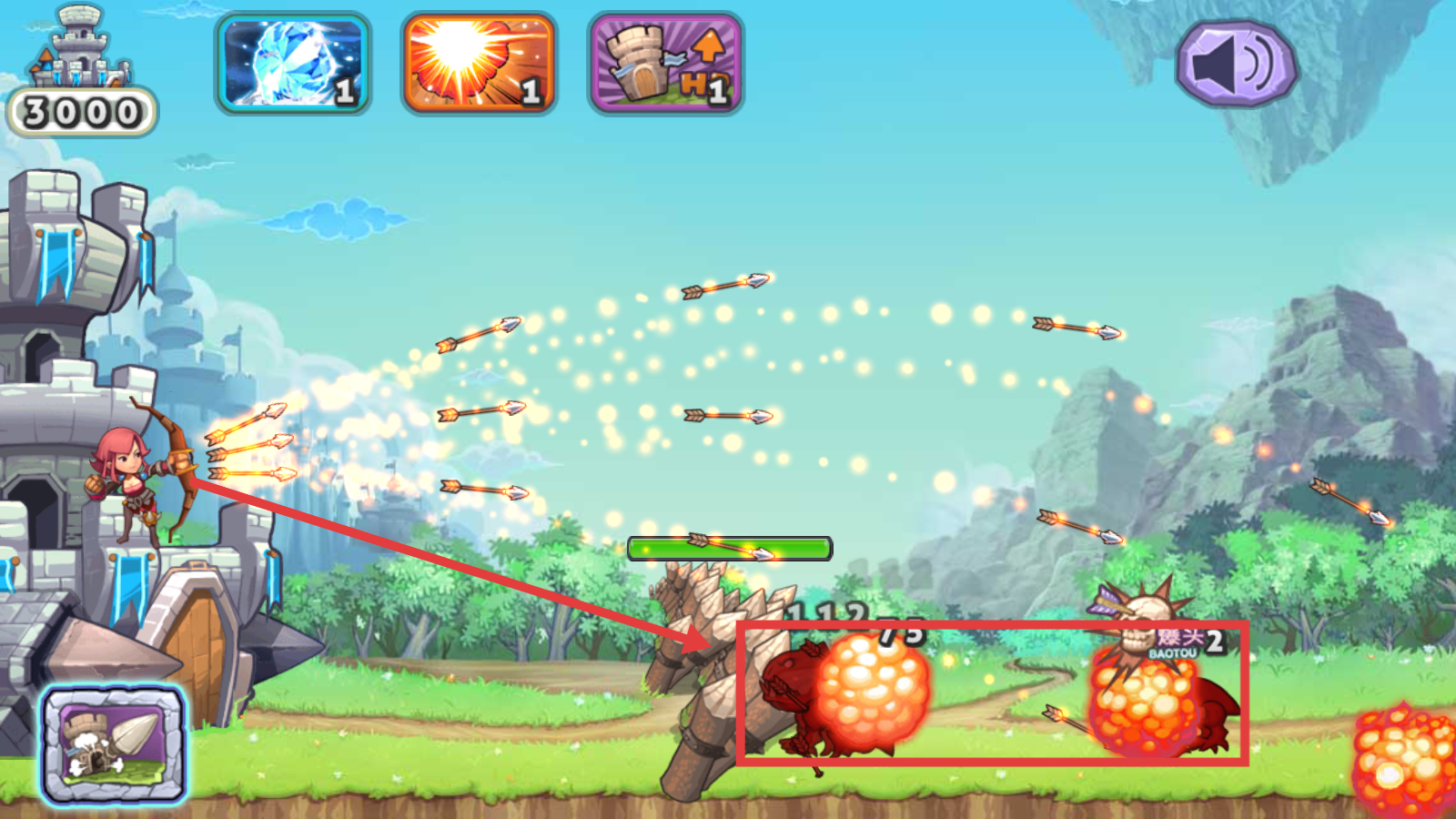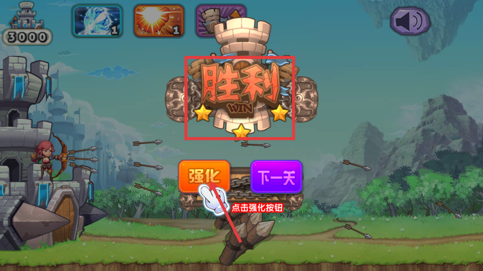 3、关注左上角【3000】城堡血量,合理使用上方三个技能道具,危急时保障城堡生存能力。