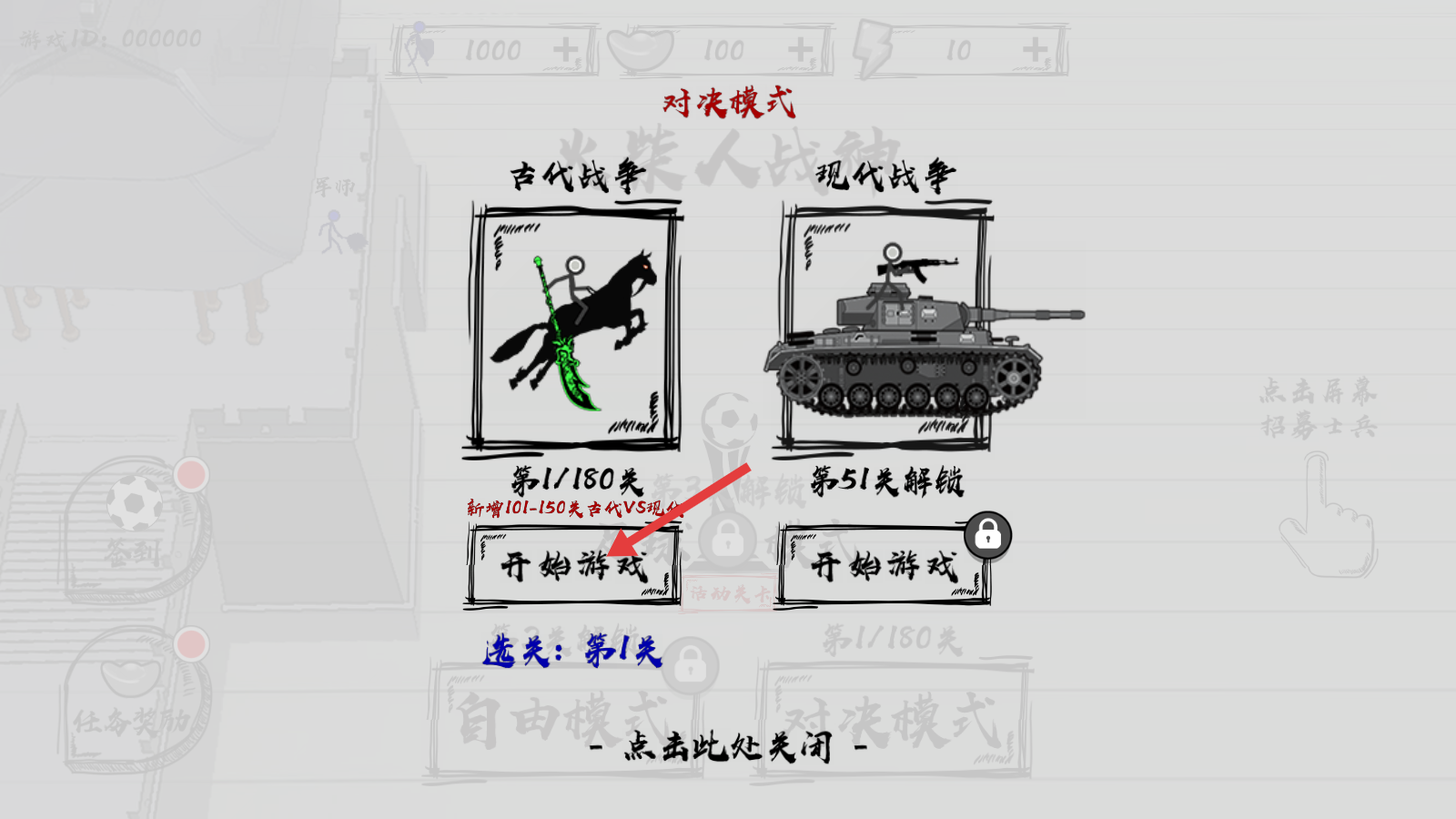 1、选择【古代战争】模式,当前为【第1/180关】,点击【开始游戏】按钮即可开启第一关对决。