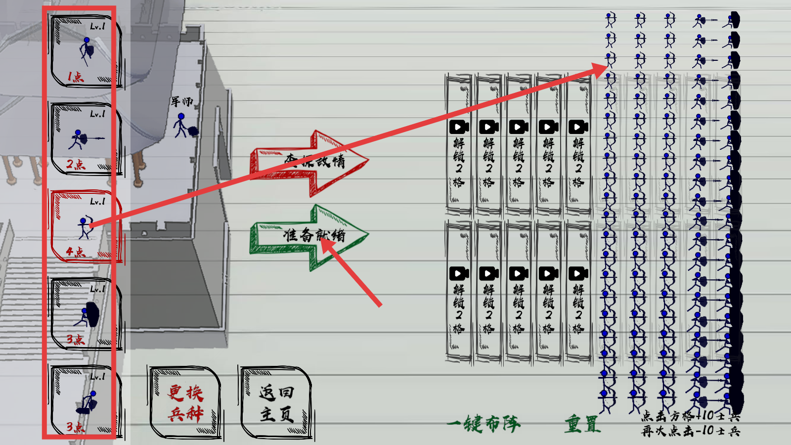 2、左侧选择【1点】【2点】等不同点数兵种布置,点击【准备就绪】进入战斗准备阶段。