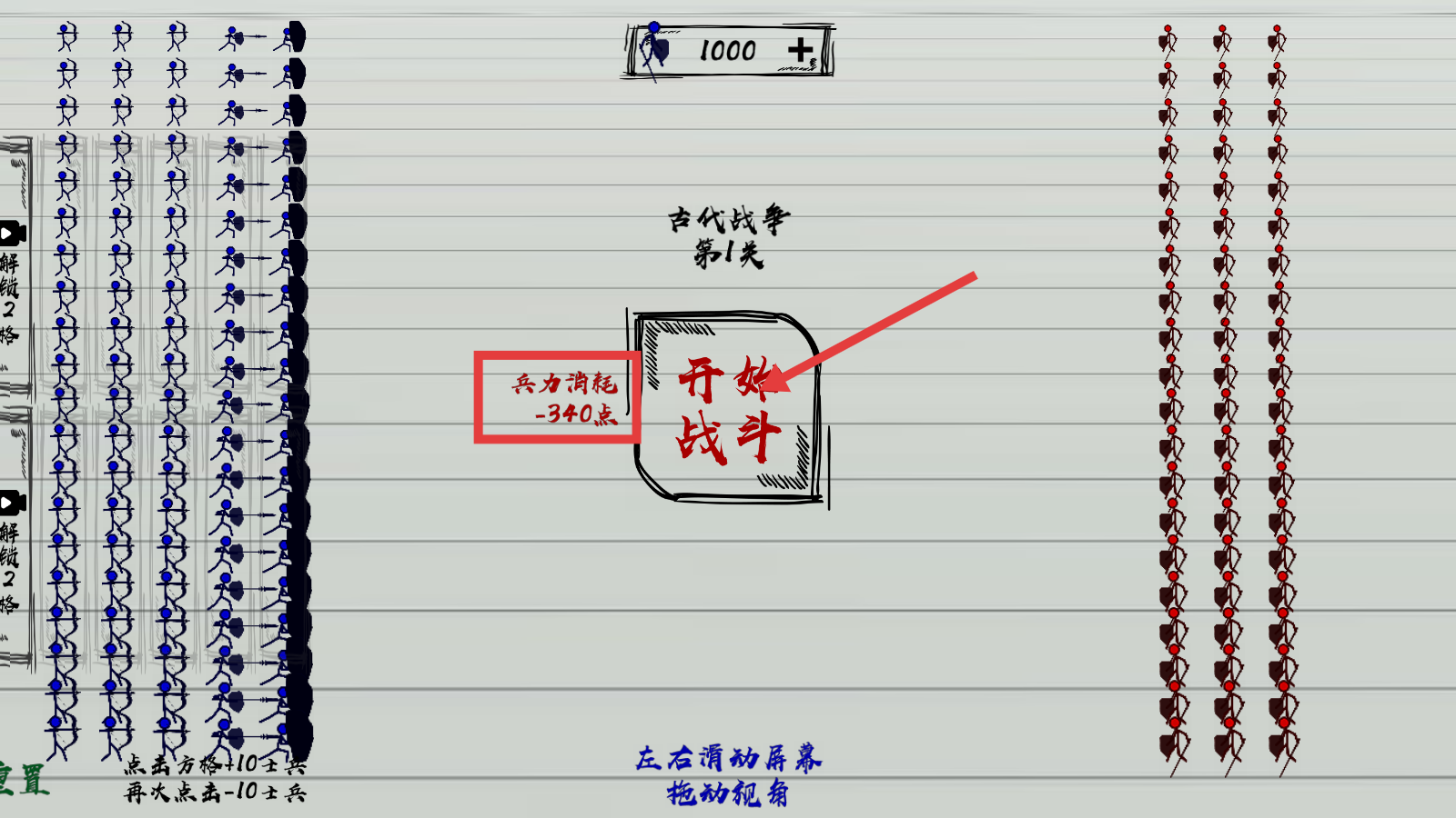 3、确认【兵力消耗-340点】,点击【开始战斗】按钮,正式开启【古代战争-第1关】的对决。