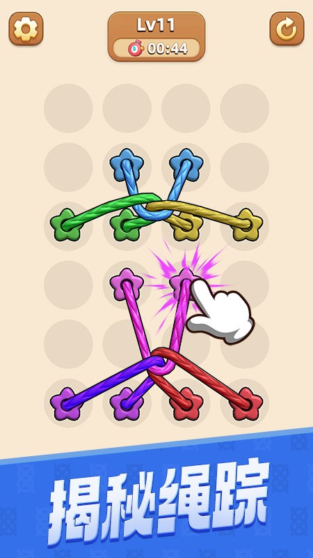 3、多维度操作反馈,绳索物理效果真实自然,拖动时会产生弹性形变,成功解开会触发舒适视觉特效。