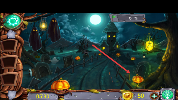 1、在墓地场景,点击南瓜、幽灵、墓碑等物品进行互动,收集隐藏道具如扫帚,留意发光点。