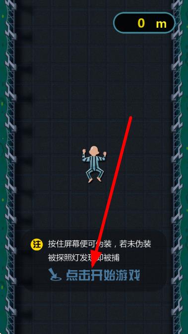 1、点击开始游戏,操控角色开始越狱,记住按住屏幕便可伪装,若未伪装被探照灯发现即被捕,下落时适时伪装躲探照灯。