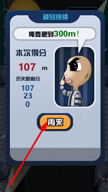 3、越狱失败后,查看“越狱成绩”,点击“再来”按钮,重新挑战,优化伪装时机,突破俺要爬到300m目标,刷新分数。