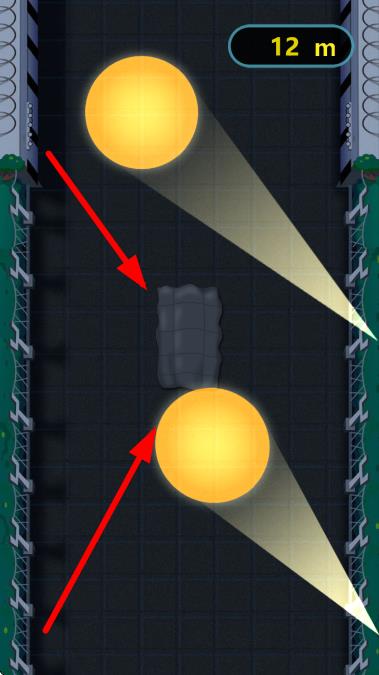 2、在下落过程,遇探照灯,按提示快速按住屏幕伪装成石块,避开光线扫描,持续下落,争取更远距离。