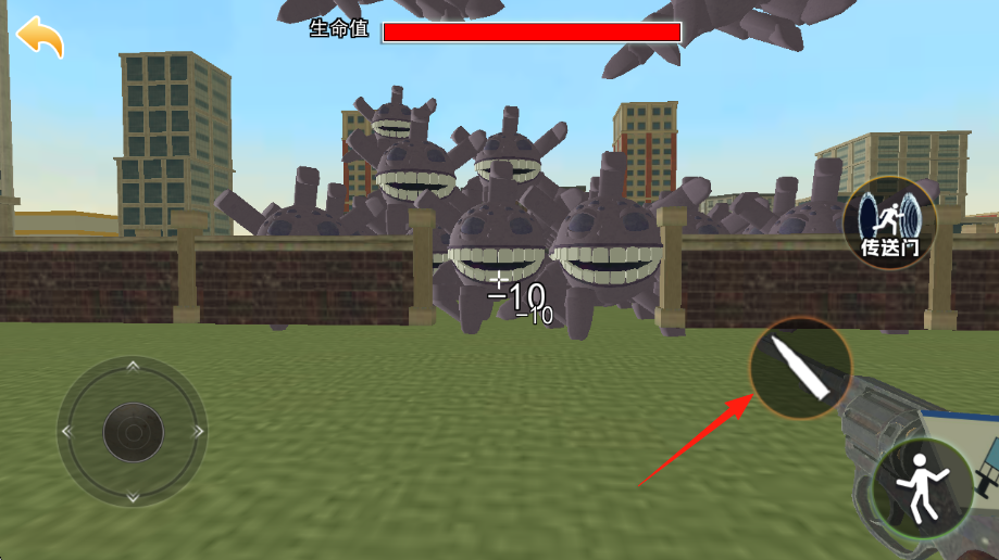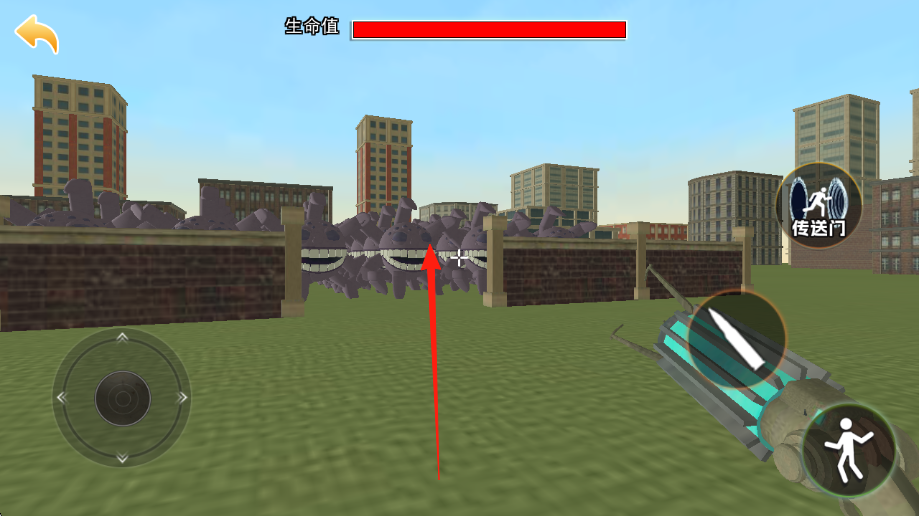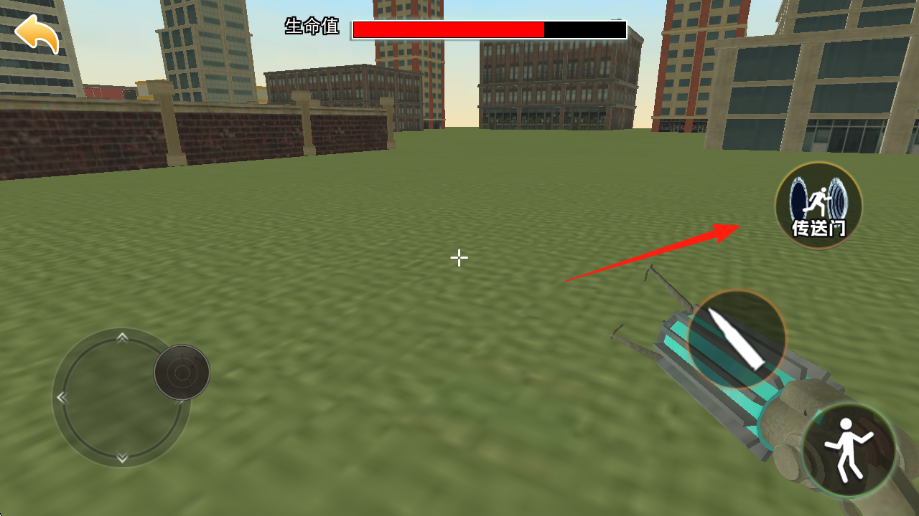 2、在城市草地场景建筑、砖墙战斗,右侧有传送门技能,可规划使用,清理完怪物波次后,推进关卡。