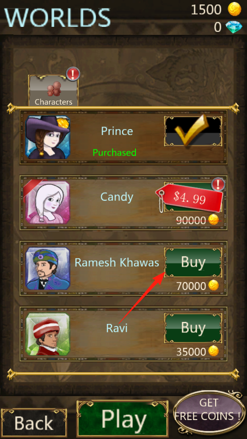 3、已购买的王子角色可以直接使用,想解锁Candy要么氪金4.99刀要么攒9万金币,看到红色箭头没,系统推荐你先买7万金币的Ramesh,性价比比3.5万的Ravi更高些。