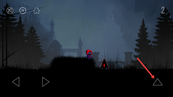 1、点击左右的方向键移动角色,遇到草丛、障碍,尝试右侧跳跃三角键通过,靠近发光的标识。