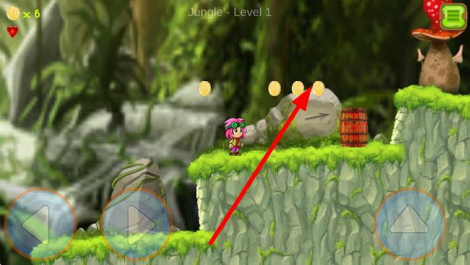 3、操控角色在丛林关卡移动,按左右箭头按钮控制方向,跳跃键跨越障碍,沿箭头指向收集金币,积累财富。