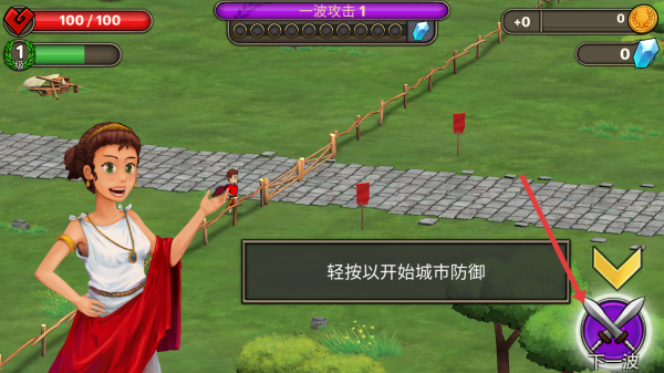 1、游戏开始时,点击界面上标有下一波的按钮,即可开始城市防御任务,迎接敌人的攻击。