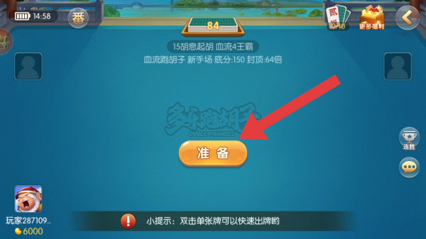 2、进入到场景内,玩家目前处于新手场,低分150,封顶64倍,可点击准备的功能按钮进行开始。
