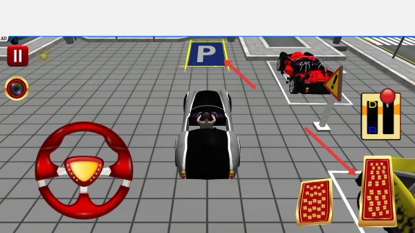 2、在停车场景中,你需要操控汽车,利用屏幕上的方向盘和加速、减速踏板,将汽车精准地停入标有P的停车位中。