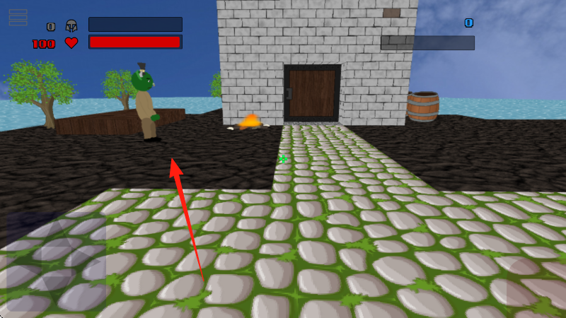 1、玩家操控角色初始在石铺道路,遇到绿皮肤NPC,场景含石屋、木桶、篝火,海边有树木,生命100。