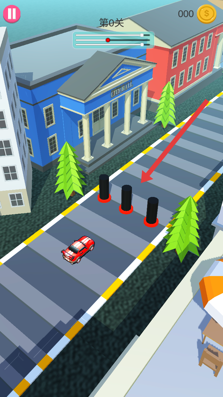 1、开局进入游戏后,点击长按操控红色赛车前进,需要躲避道路上的黑色路障,尝试通关这一关。