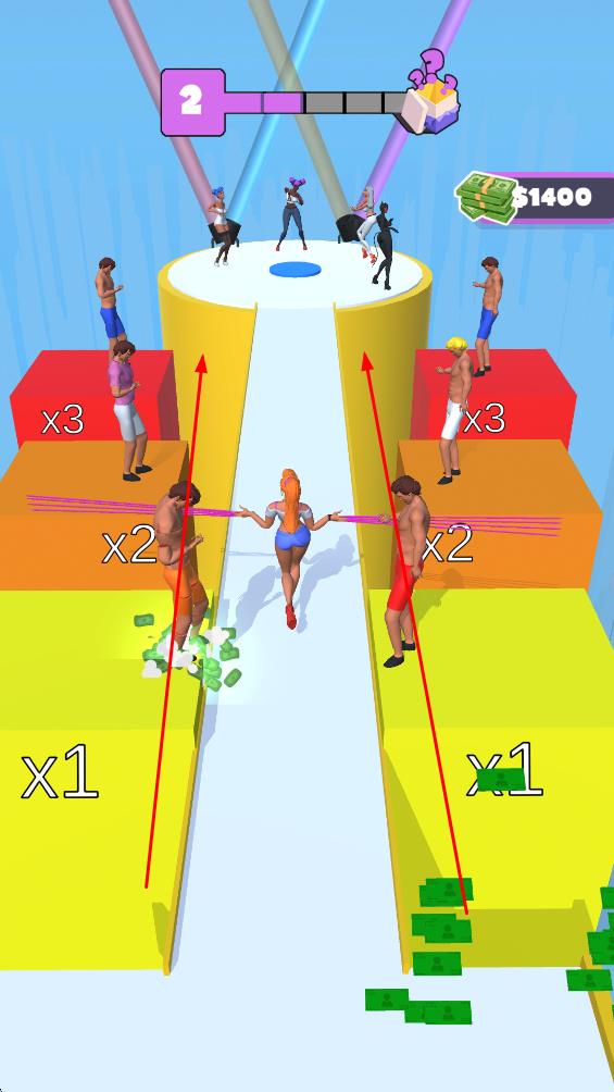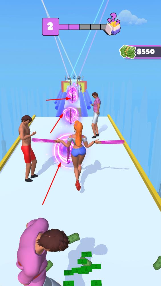 1、操控女性角色在跑道上左右移动,收集散落在地面的绿色钞票,积累金钱,开启关卡挑战之旅。