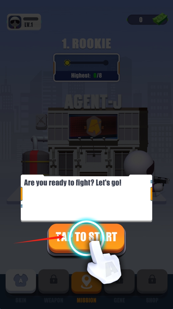 1、在Agent-J界面,点击TAP-TO-START,开启特工J的战斗之旅,点击按钮开始游戏。