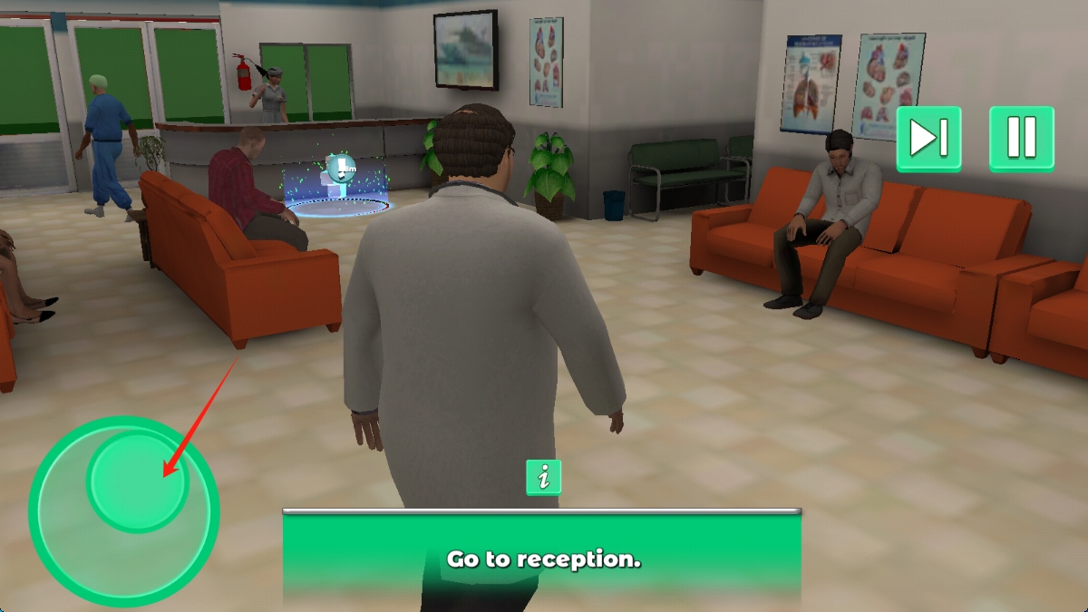 3、游戏中,操控医生角色,按照提示Go-to-reception前往接待处,完成医院日常任务,拨动轮盘移动。