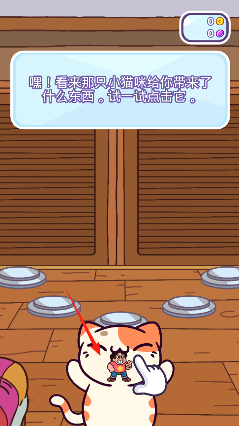 1、按照对话框提示点击小猫头上的小人,它会给你带来小礼物,右上角的黄紫圆圈会记录收获数量,小猫每次被点击都会变换表情,多试几次说不定能触发特殊反应哦。