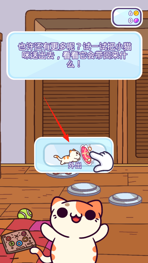 2、点外出按钮让小猫去探险,3G流量标志说明需要消耗资源才能执行这个操作,等小猫回来后,右上角的数字会更新,显示它带回来的新物品数量。