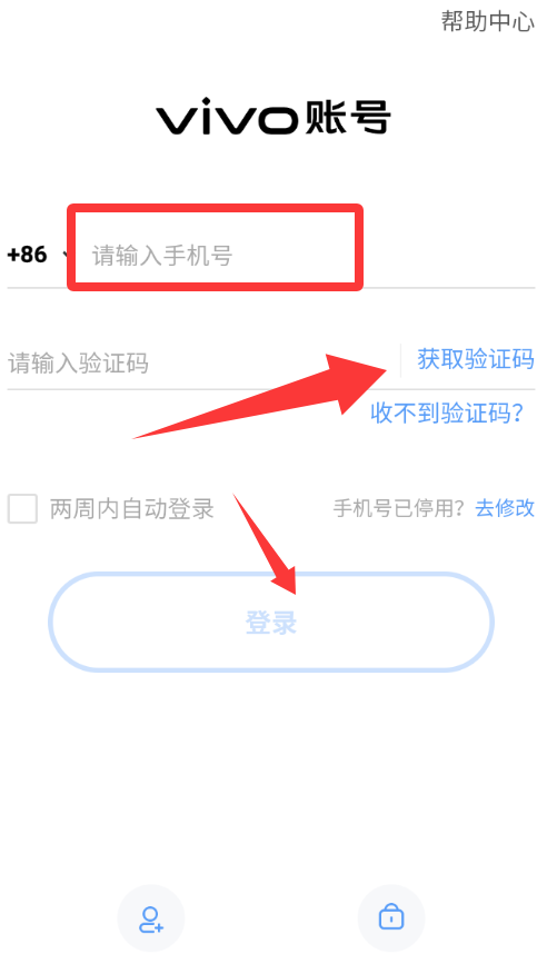 2、输入手机号码获取验证码然后登录。