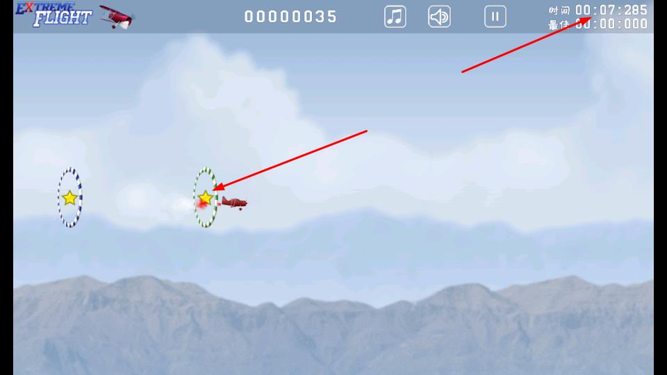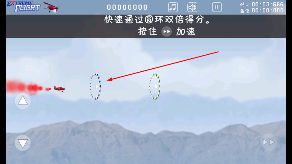 2、在飞行过程中通过虚拟方向键操控飞机转向,按住加速按键提升速度,瞄准空中的圆环穿越,快速通过圆环可获得双倍得分,同时留意时间与分数数据。