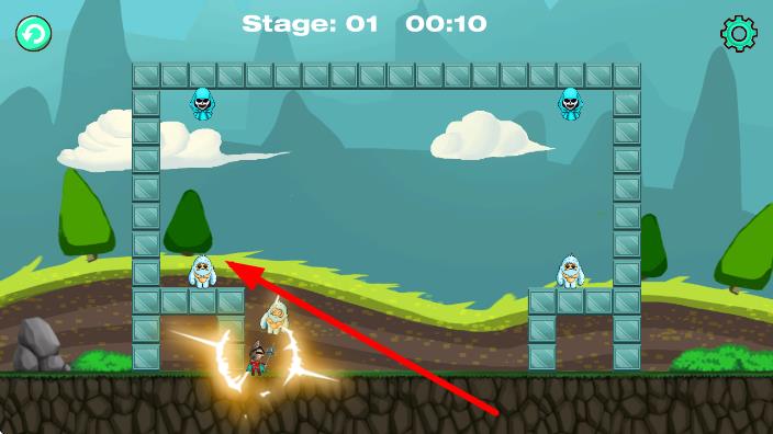 3、沿箭头方向,操控骑士跳跃障碍,攻击蓝色、白色敌人,注意时间,快速推进,完成Stage:01。