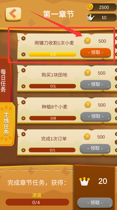 4、打开任务面板,完成"收割麦田"等引导任务后,领取对应酬劳。