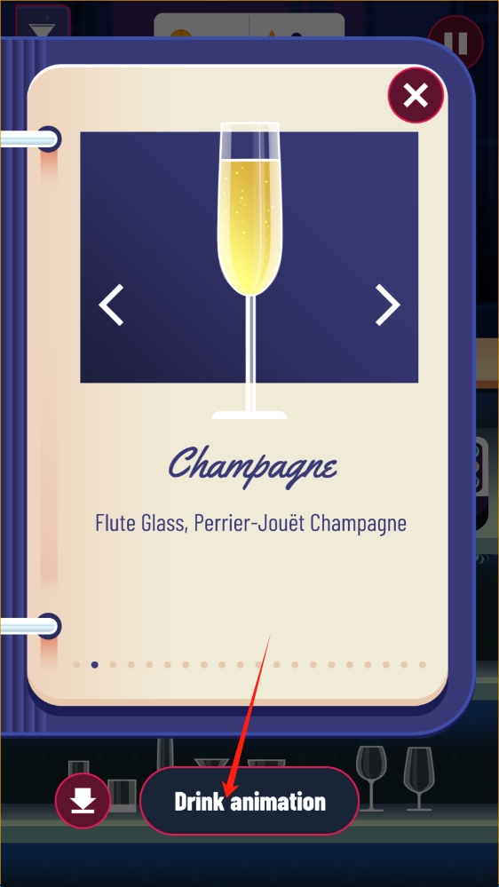 2、进入酒水信息界面,了解Champagne等酒品知识,点击Drink-animation,查看饮用动画。