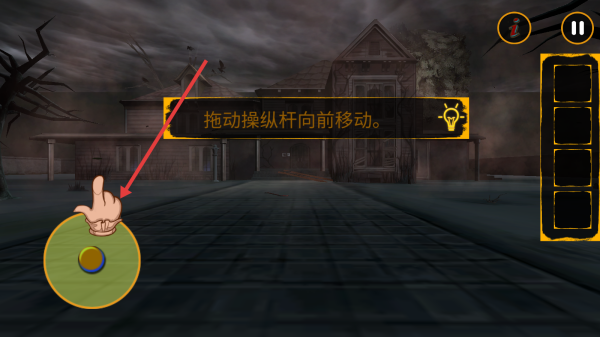1、第一关按照指头的指引,拖动摇杆左下角向前,靠近老屋,继续引发新的操作的提示指引。