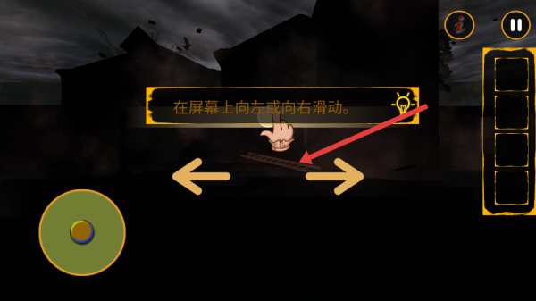 2、出现滑动的提示时,在屏幕箭头的区域左右滑动,调整视角或者移动角色方向,探索场景。