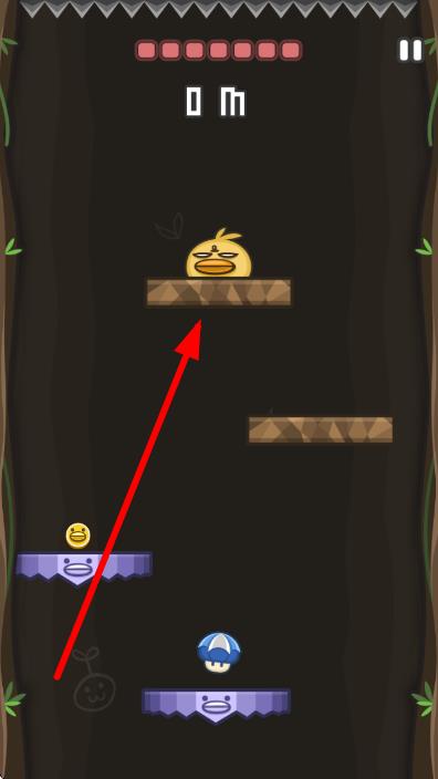 2、进入洞穴关卡,操控黄色角色在平台跳跃,沿箭头方向移动,避开尖刺,收集下方小鸭子等道具,向下探索。