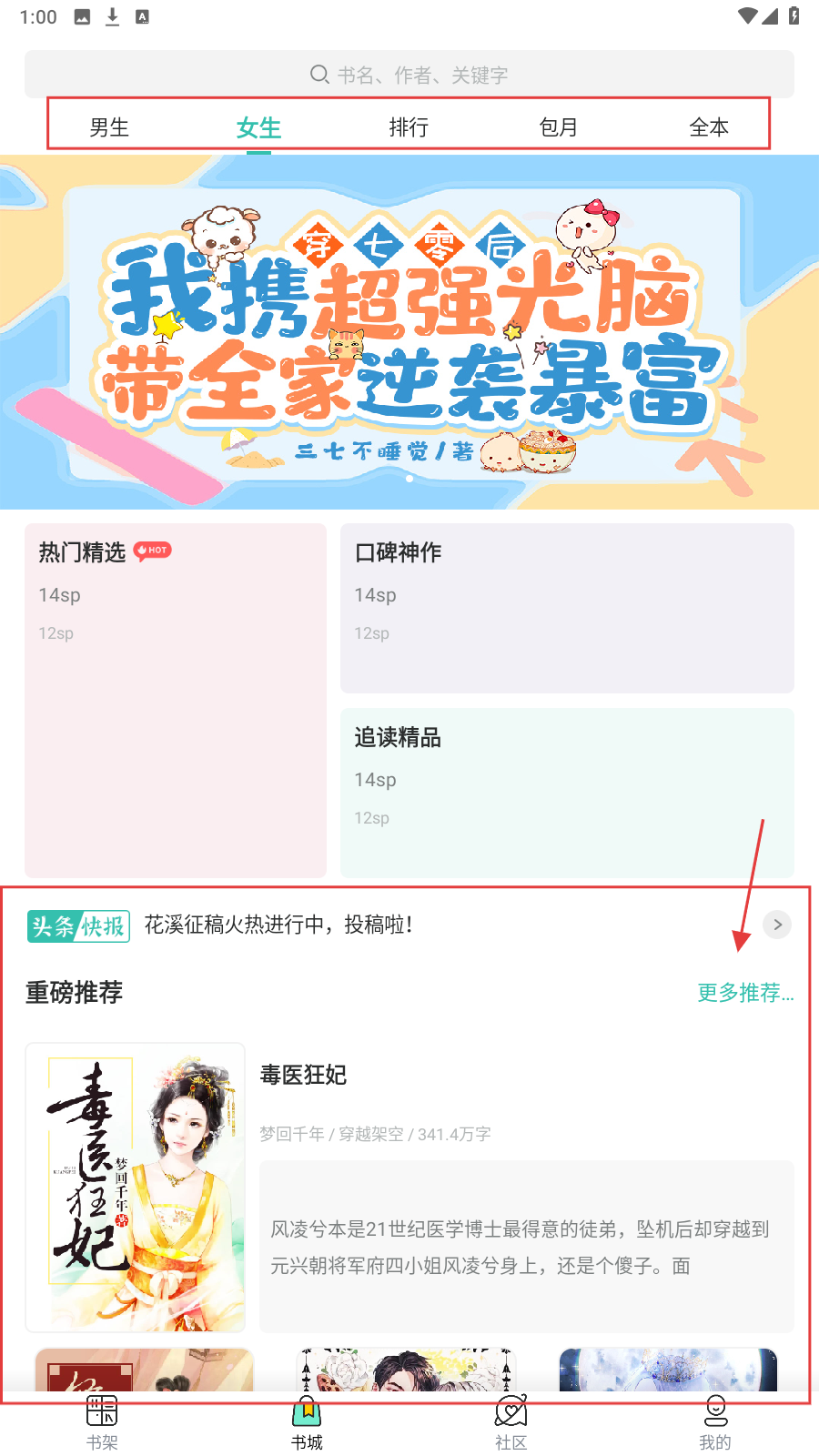 1、进入书城选【女生】分类,点【更多推荐】浏览更多小说找感兴趣内容。
