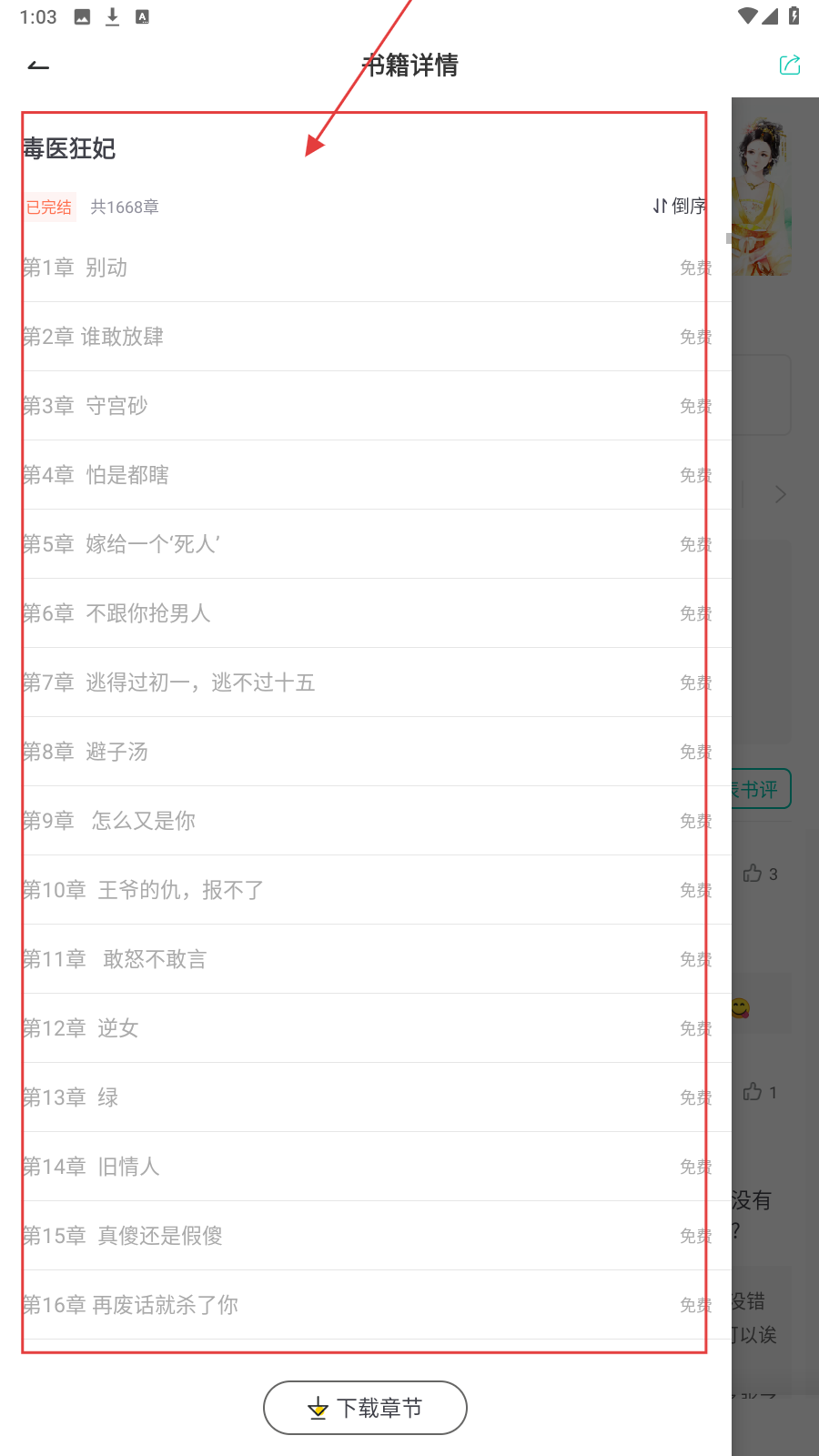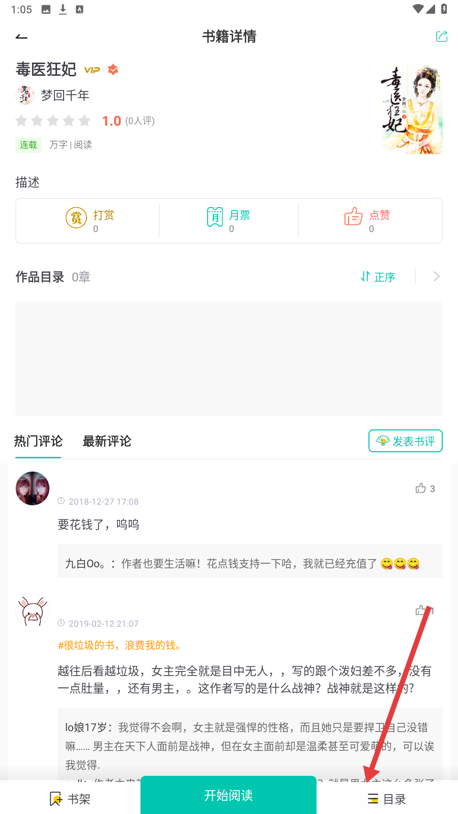 2、打开《毒医狂妃》详情页,点【目录】查看书籍章节。