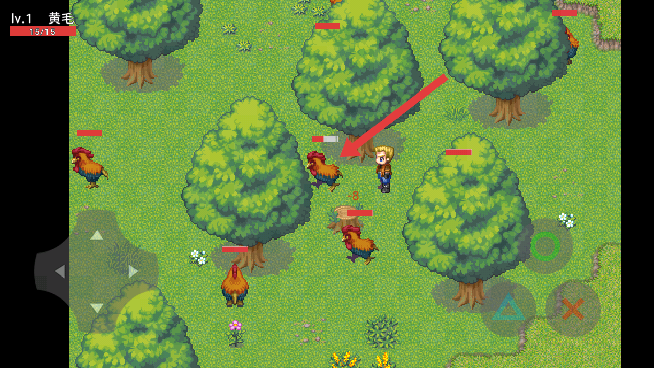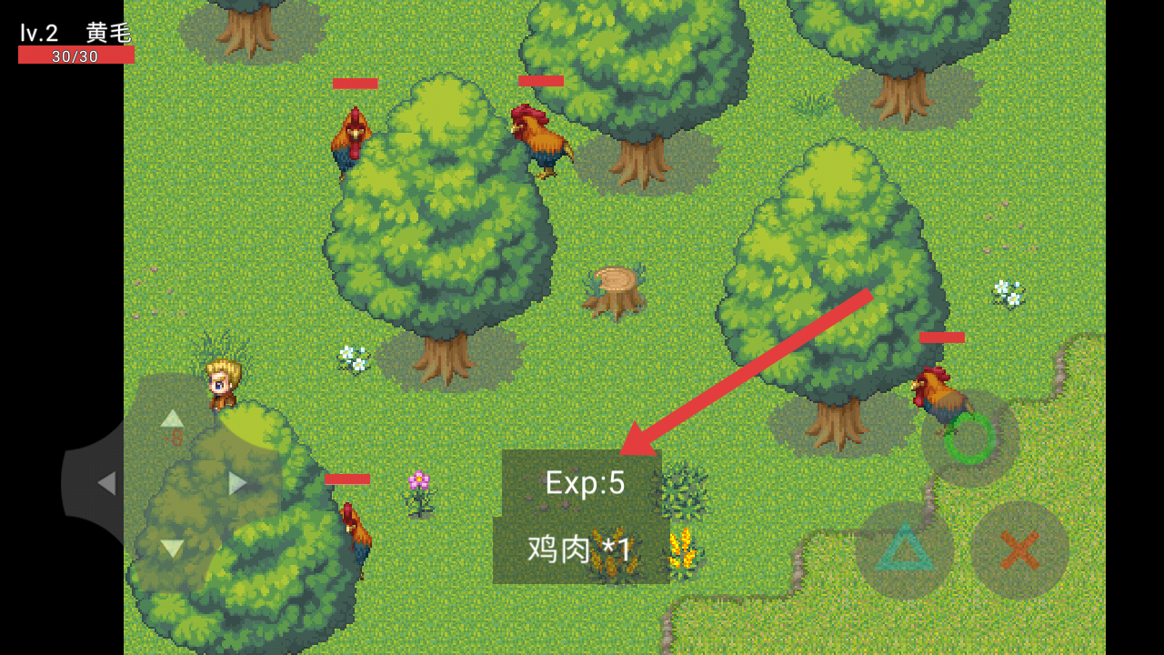 3、击败公鸡后,可以获得Exp:5和鸡肉x1,重复战斗积累奖励,满足NPC对鸡肉的需求。