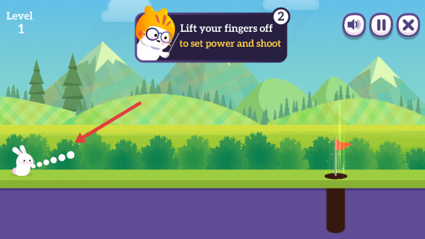 2、按提示长按屏幕蓄力,松手发射,控制兔子将球沿轨迹打向球洞,注意避开草丛等障碍。