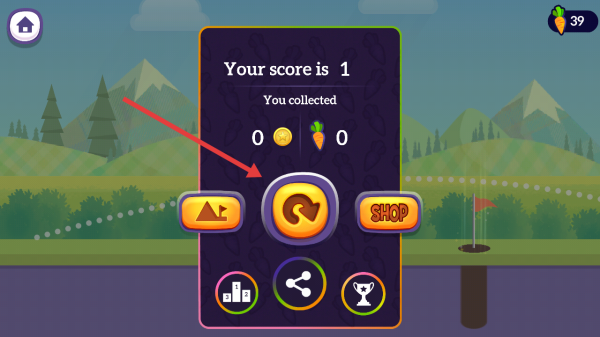 3、若未成功进洞,点击重新挑战按钮,调整击球力度与角度,争取更低杆数、更高得分,积累胡萝卜。
