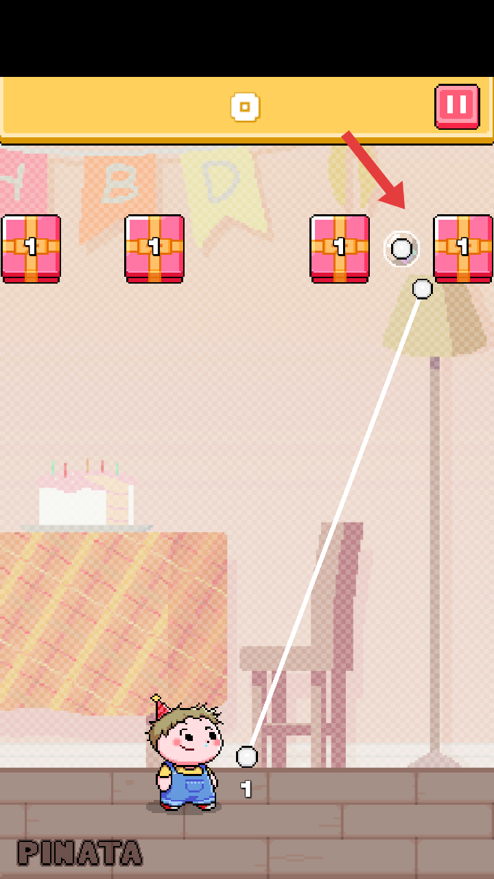 2、操控角色投掷小球,瞄准白色小球或者礼物的位置,集中白色小球能够增加我们发射出来的小球数量。
