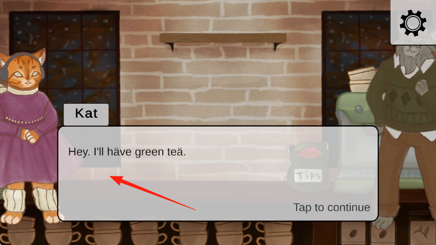1、点击穿紫毛衣的猫咪Kat,触发对话,它提出点绿茶greentea需求。