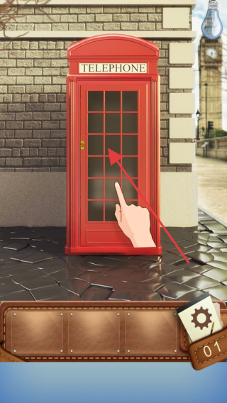 2、在游戏场景中,根据手指指引,点击红色电话亭的门,尝试与之互动,寻找逃脱的线索和方法。