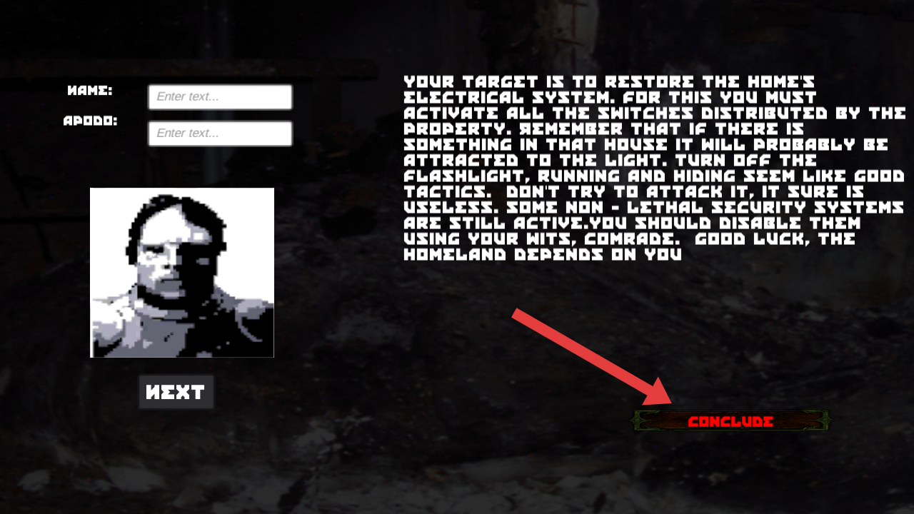 1、填写角色信息后,点击CONCLUDE,确认设定并进入游戏,开启修复房屋电力系统的任务。