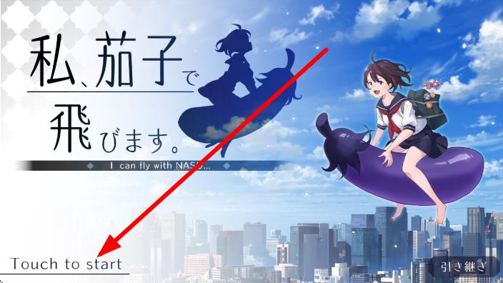 1、点击Touchtostart,开启私、茄子で飛びます的游戏,进入奇幻飞行冒险,操控角色骑茄子飞行。