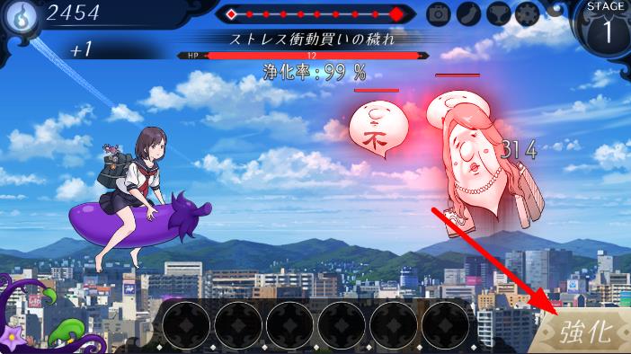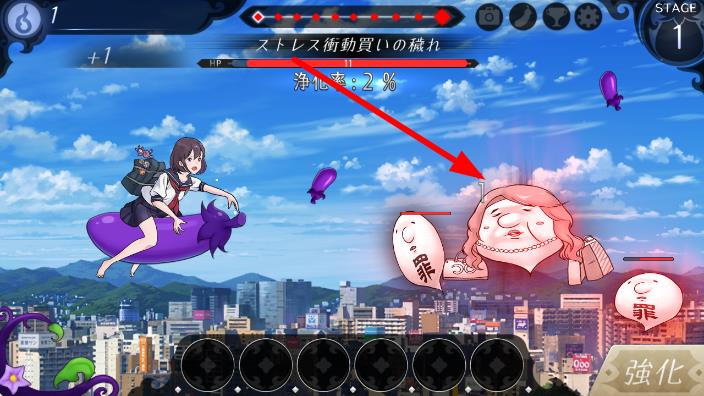 2、在STAGE1,面对“ストレス衝動買いの穢れ”敌人,攻击粉色“罪”标记目标,提升净化率。
