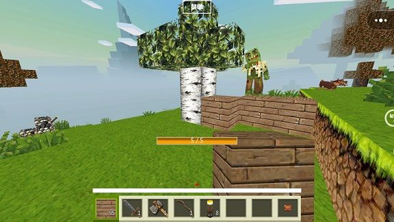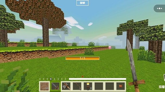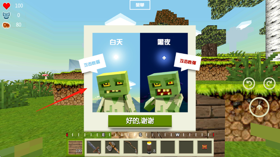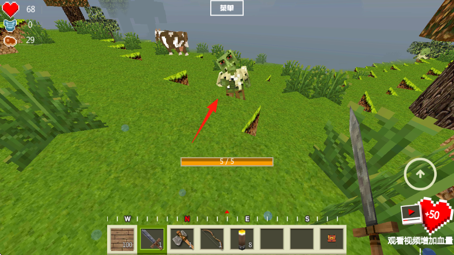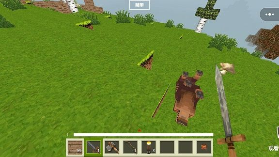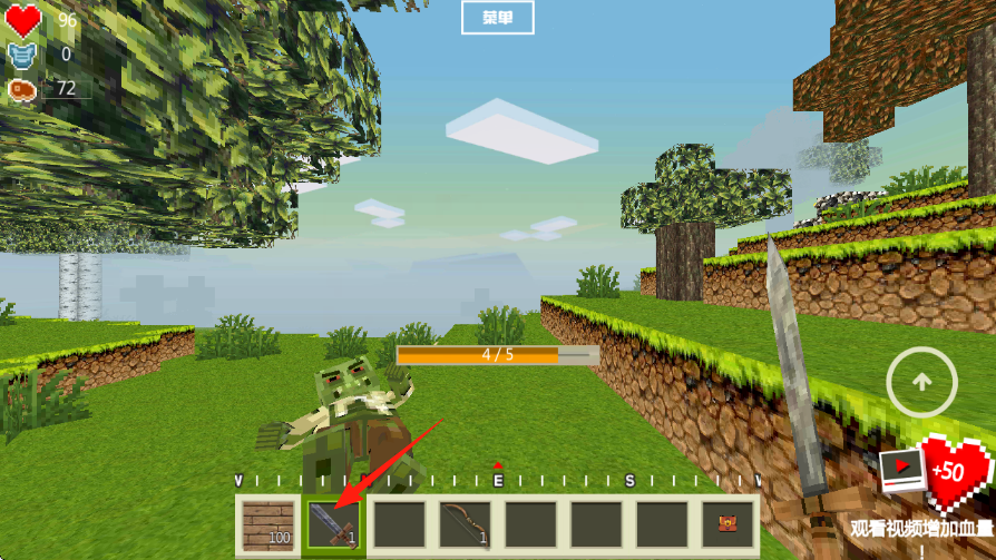 3、点击快捷栏武器剑,靠近僵尸攻击,利用地形草地、坡地周旋,击败僵尸获取资源,维持生存。